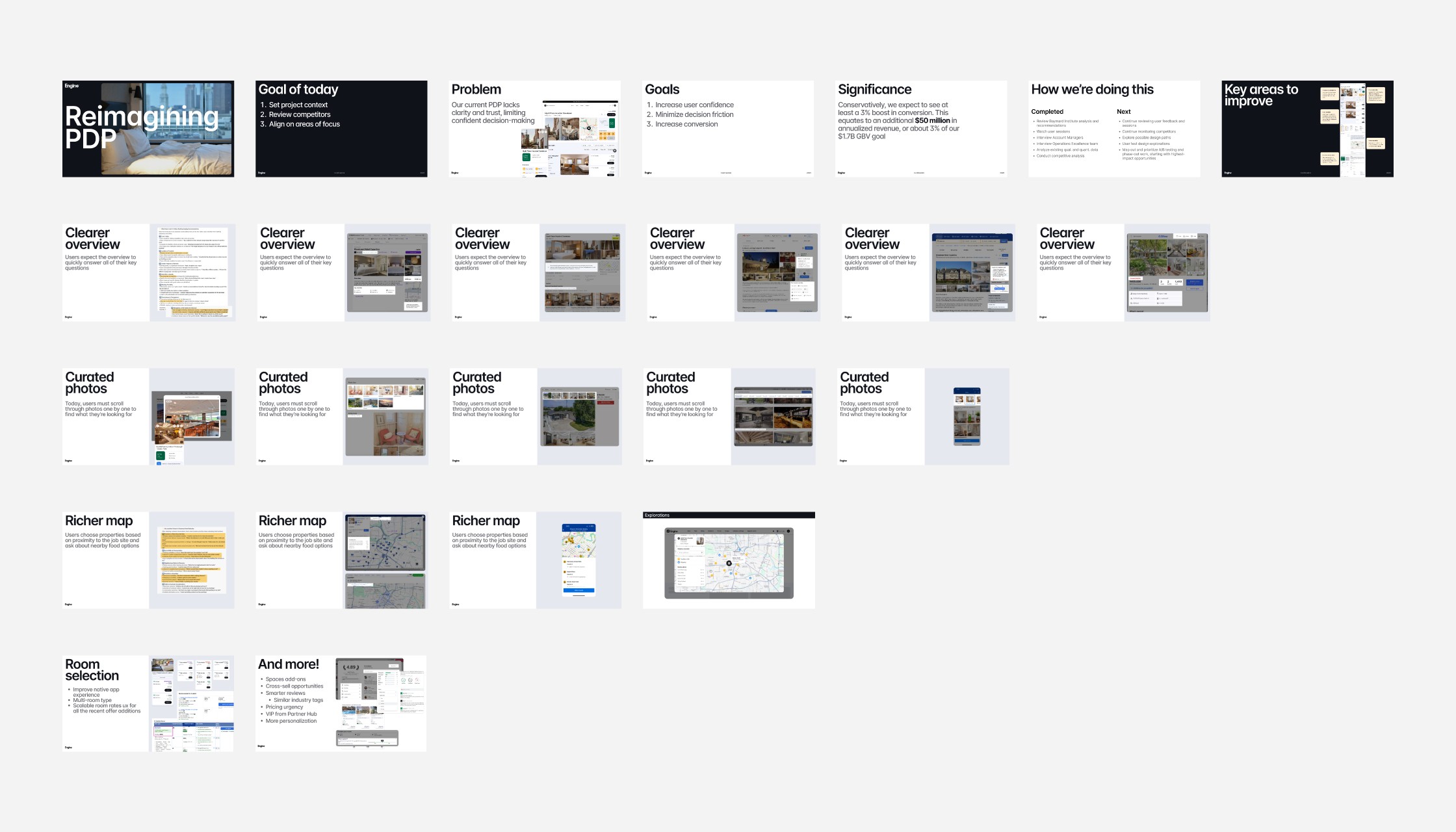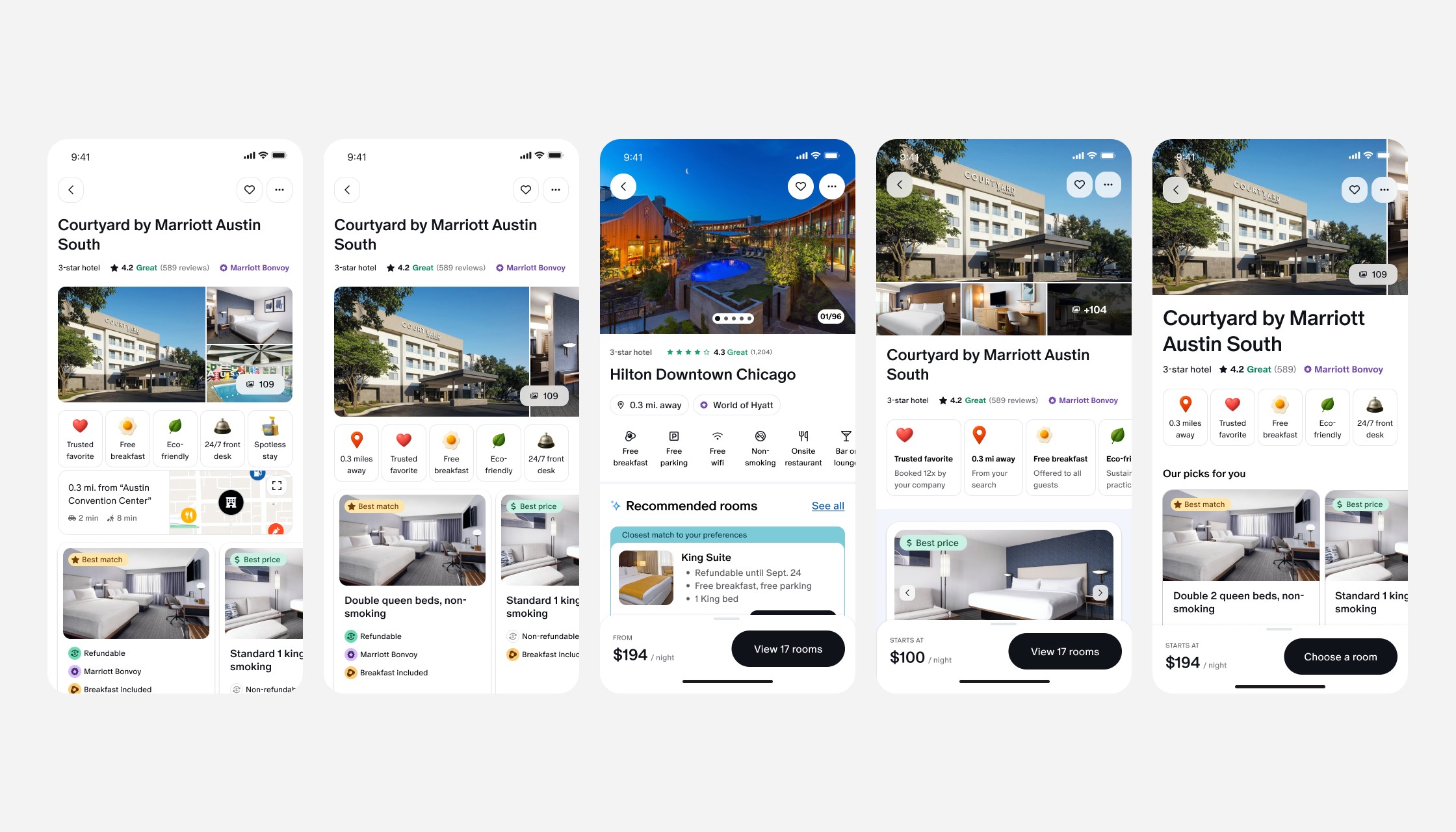 With the decision-critical framework established, I explored a range of layouts for both desktop and mobile — experimenting with full-width photography, bento-style grids, traditional stacked layouts, and sidebar approaches. Each exploration was evaluated through the lens of the business traveler, asking whether the layout surfaced the right information at the right moment to confidently answer both booking questions.