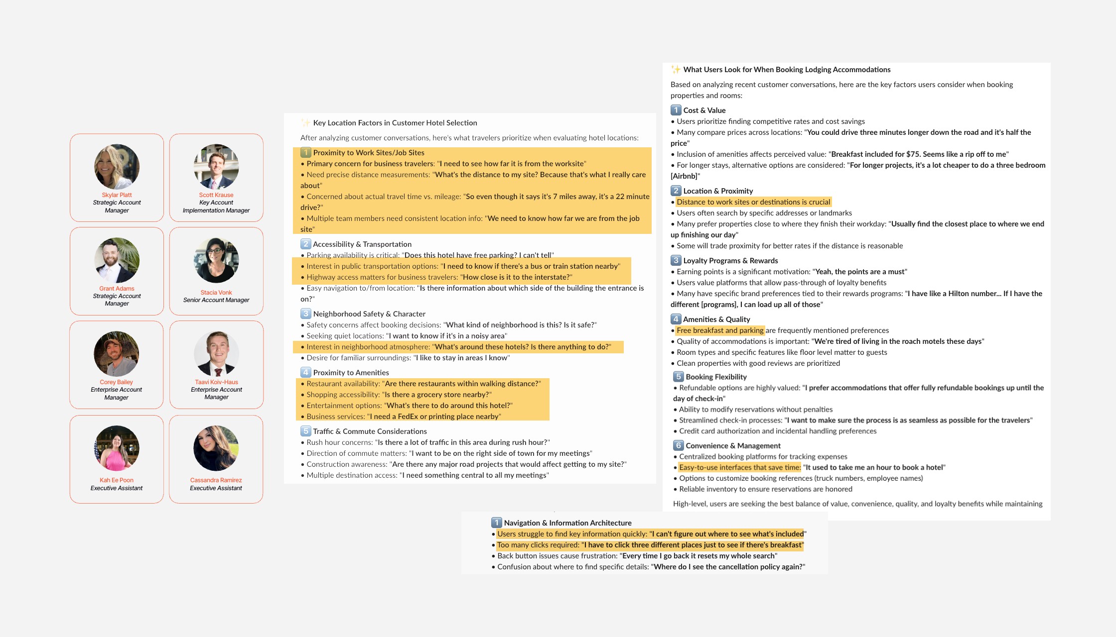 To supplement my research with real-world context, I interviewed account managers who work directly with our B2B clients. Their insights surfaced key user pain points, recurring feature requests, and frequently asked questions — giving me a clearer picture of what business travelers struggle with and what they value most in a booking experience.