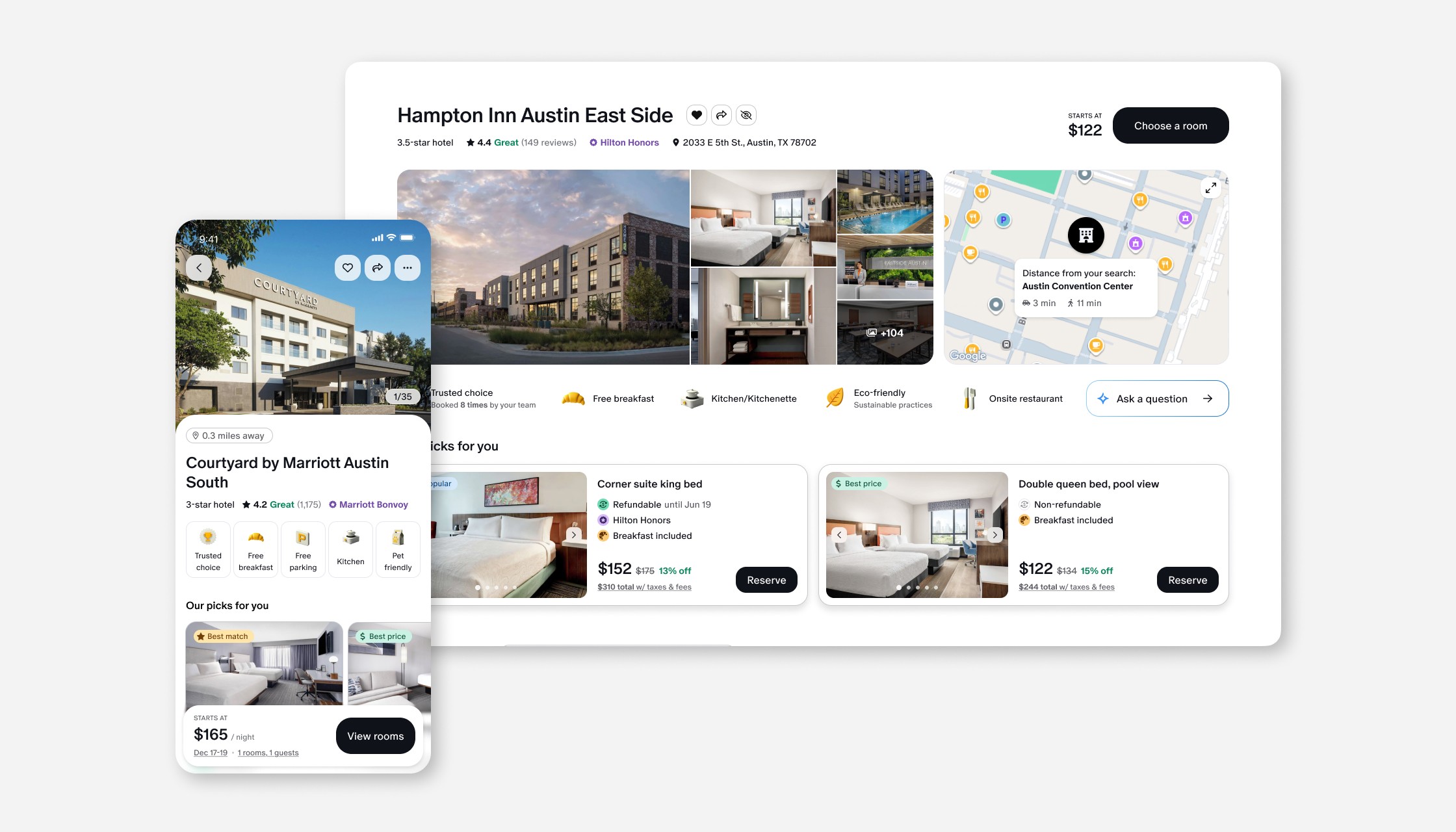 To design an effective property details page, I needed to answer two core questions on behalf of the user: Is this the right hotel for me? And if so, what is the right room? These became the guiding framework for the entire design — ensuring that everything above the fold was decision-critical, surfacing only the information needed to answer both questions with confidence.