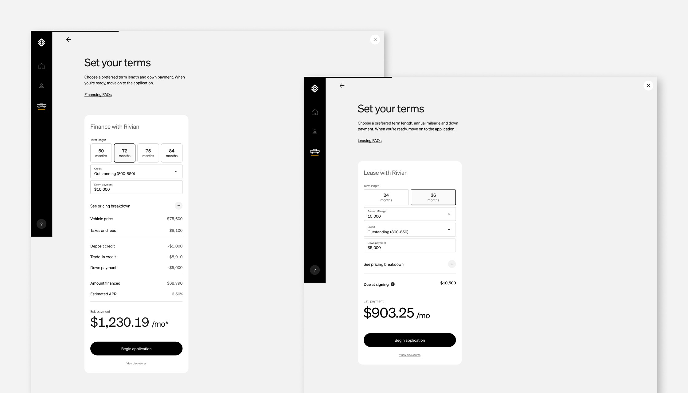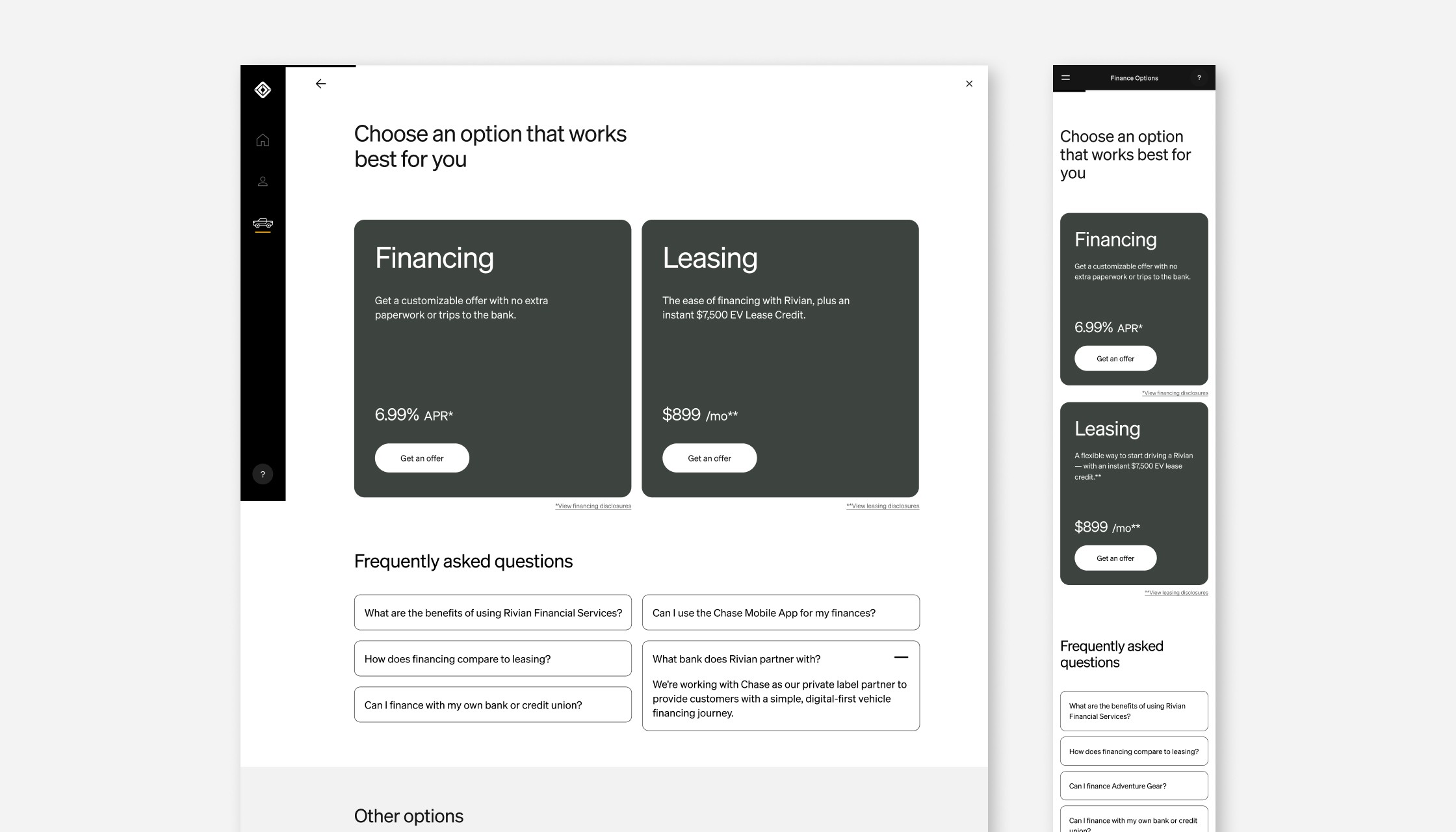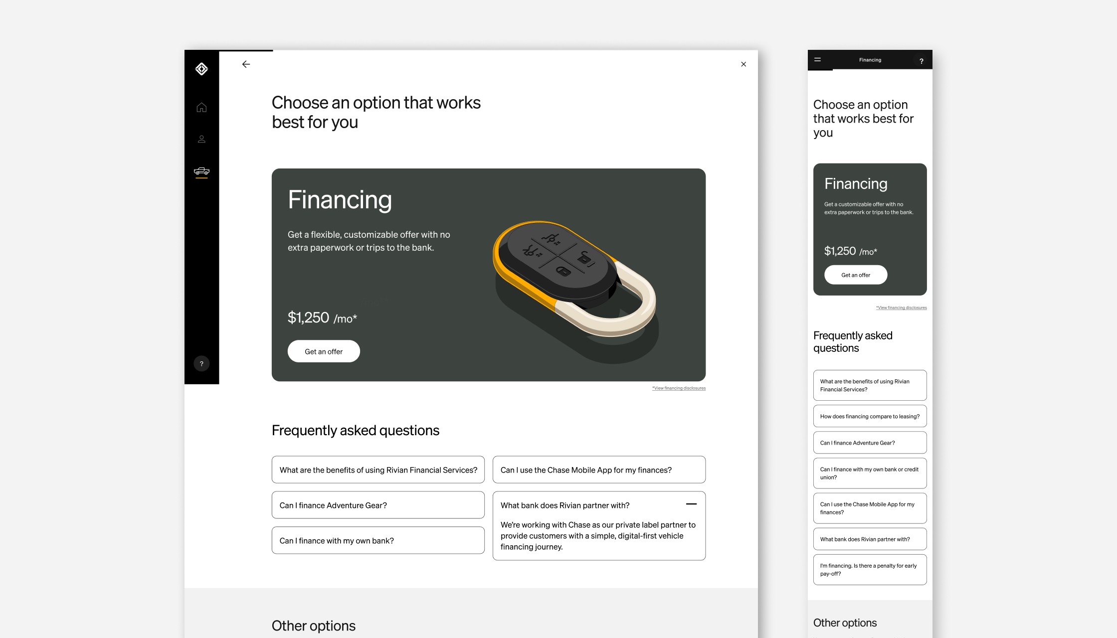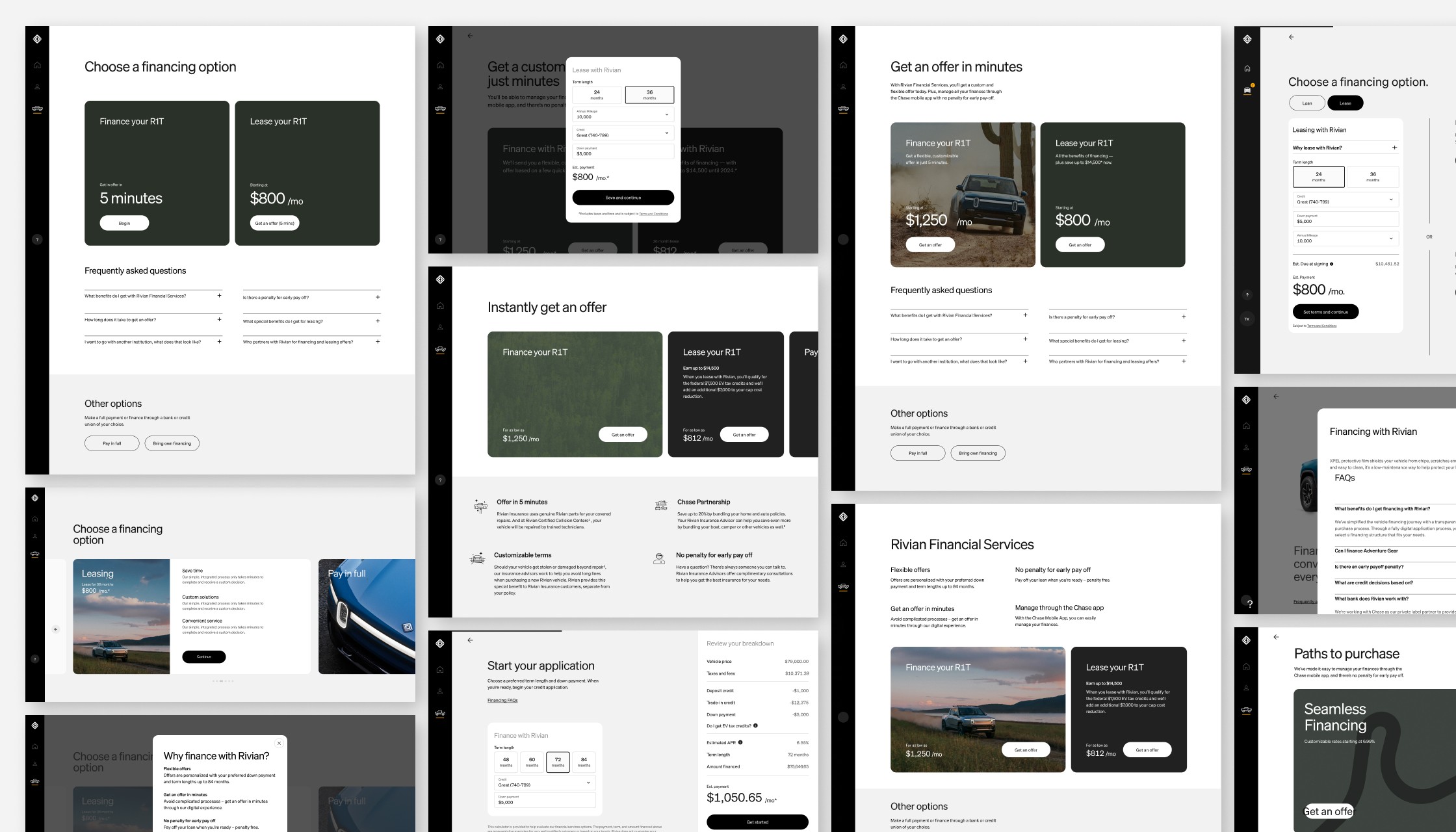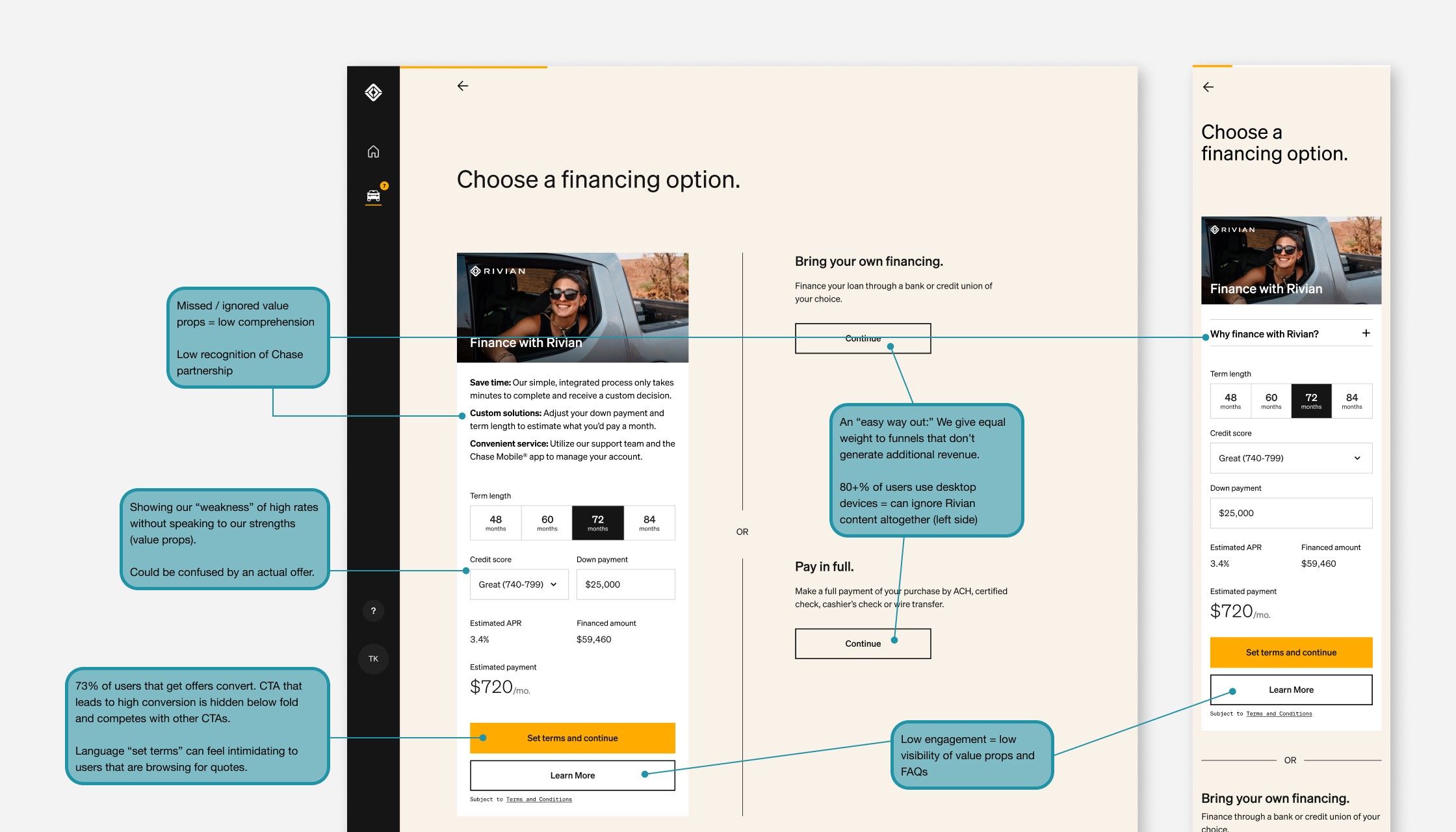 With Rivian vehicles being unprofitable at the time of this project, tapping into profitable areas of the business was critical. I had an ambitious goal to redesign the financing page to increase revenue for the business and clarity for customers.