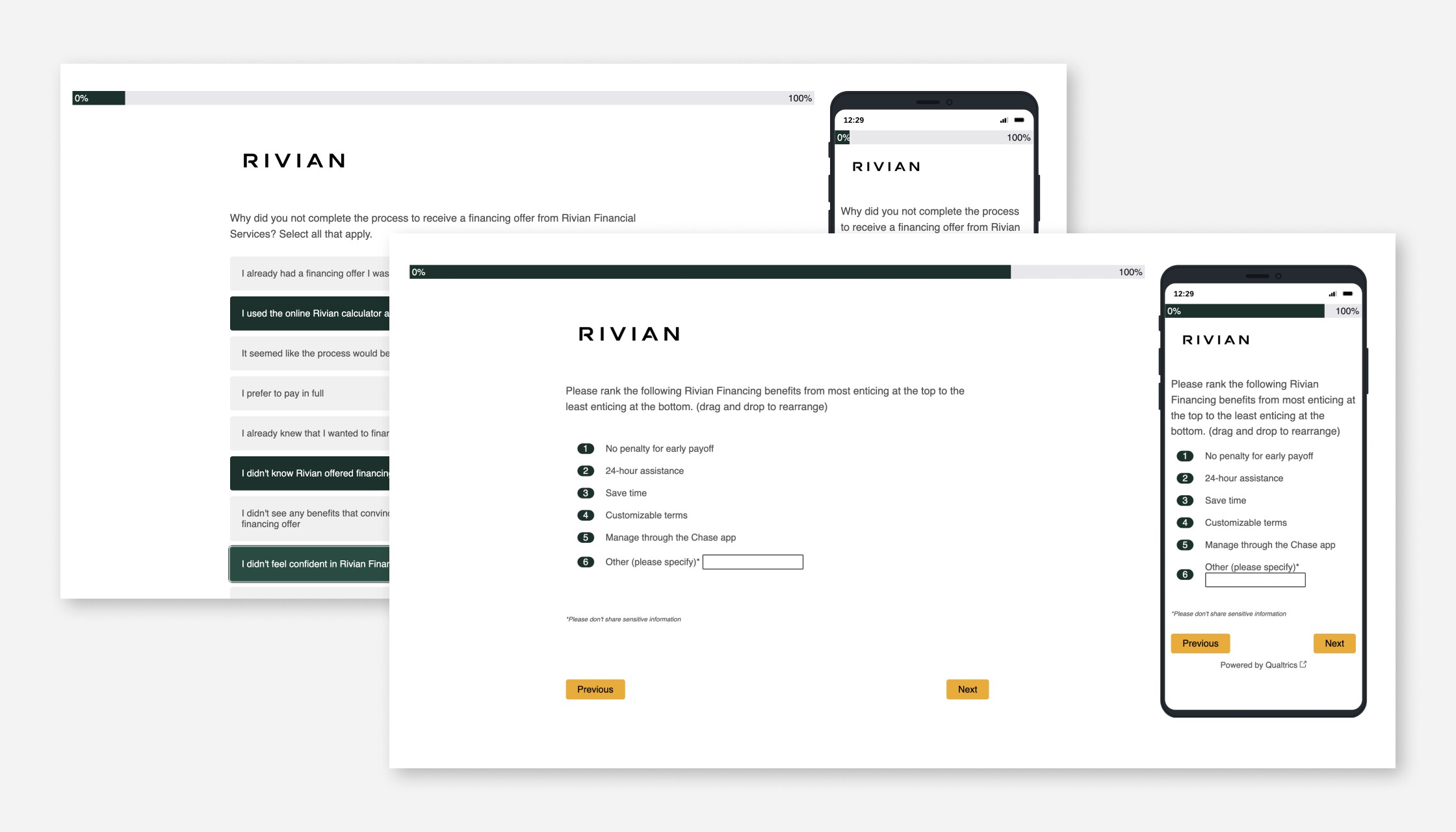 Before designing, it was imperative to collect data from real customers. My goal was to understand why or why not customers chose Rivian Financial Services and gather insight on what copy and design could influence to improve rates.