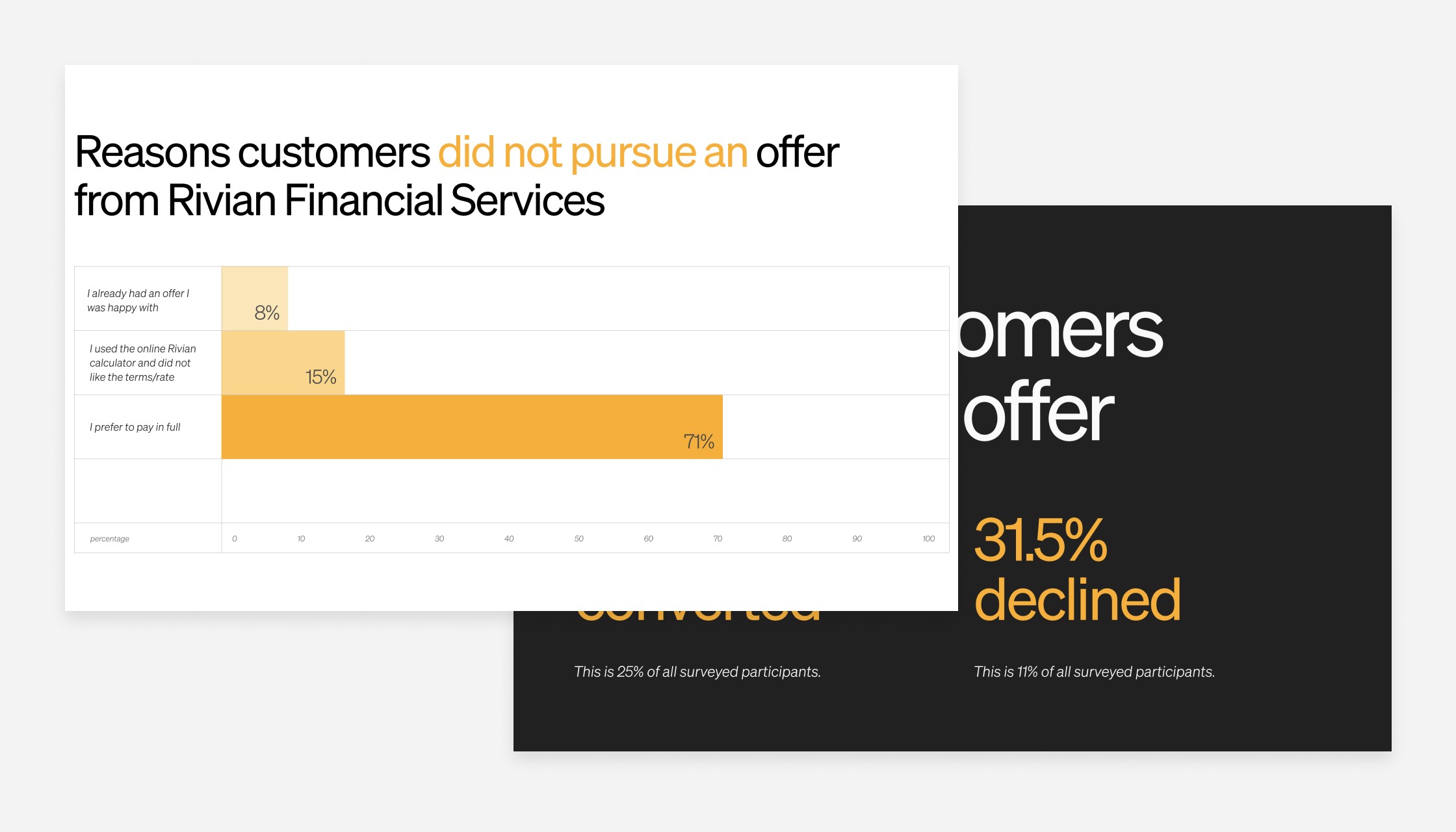 I consolidated the data and key takeaways in a presentation to share with stakeholders. This data was valuable for various teams across Rivian and shared with the team at Chase, including the president of auto loans.