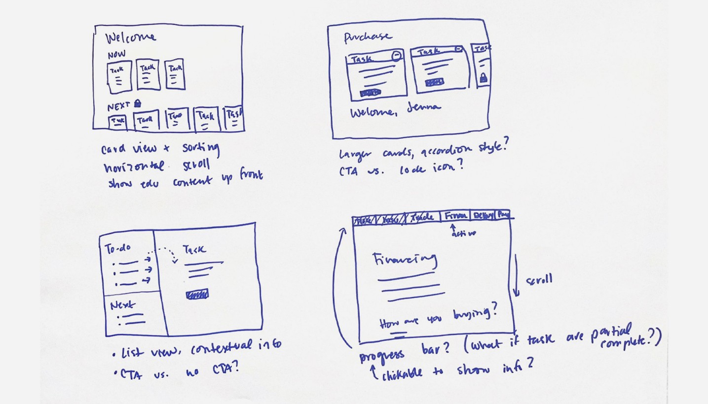 With a clear understanding of our problem and user needs, we outlined several low fidelity iterations with different architectural information strategies. We considered lists vs. cards vs. sections and explored possible loading and locked iconography.