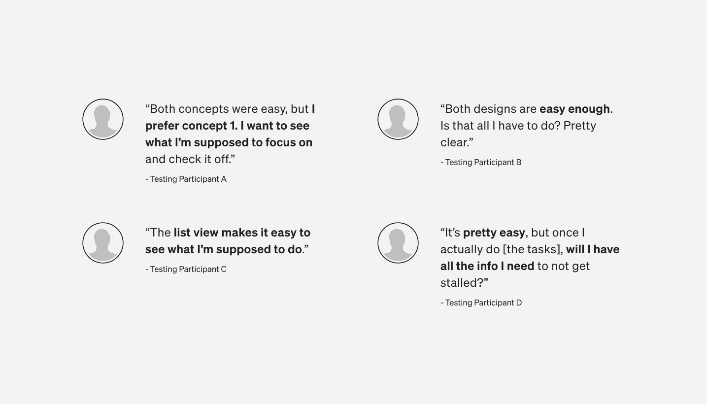 👍 All users were able to complete an open task and understand what tasks are locked/unavailable.