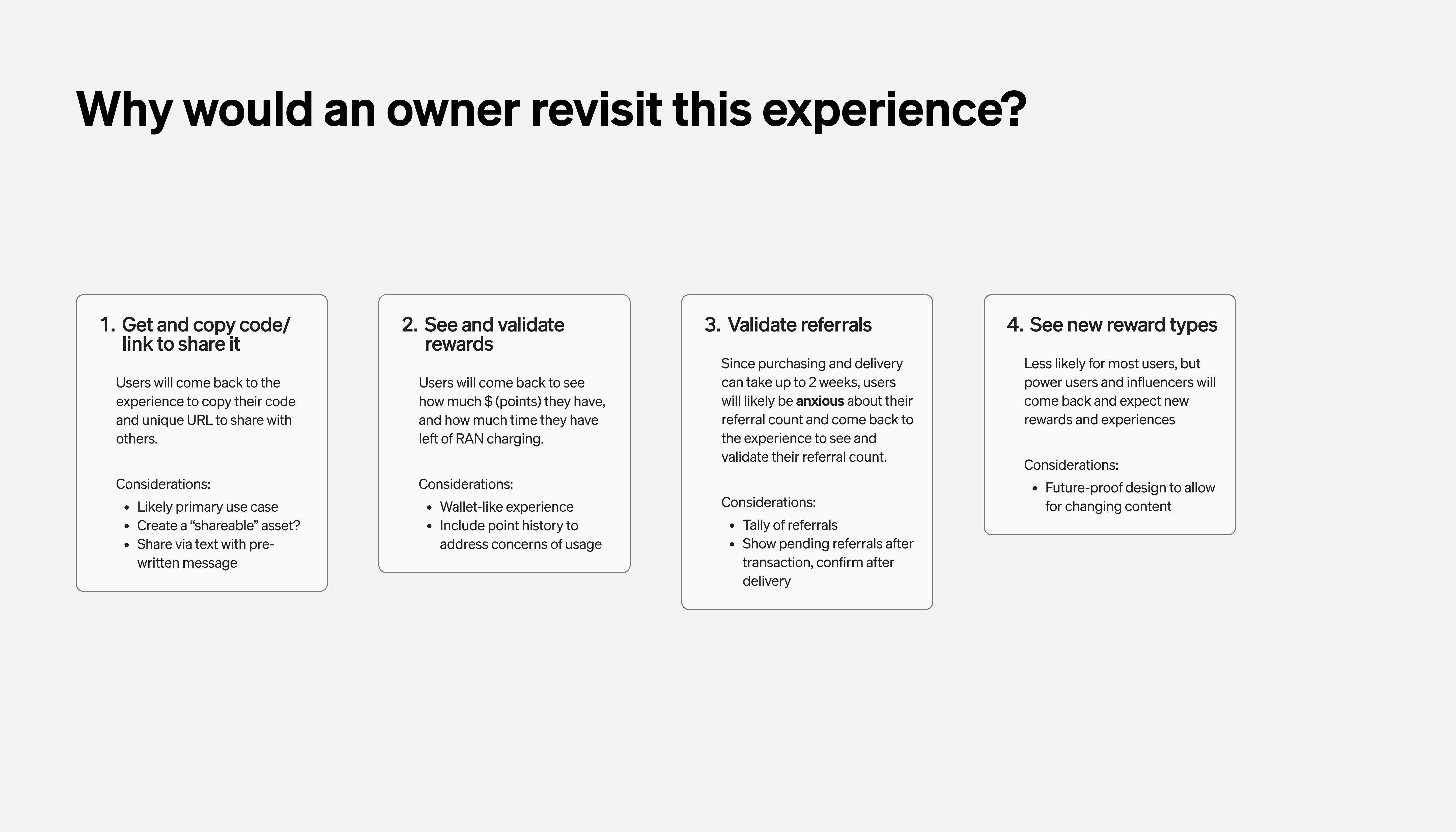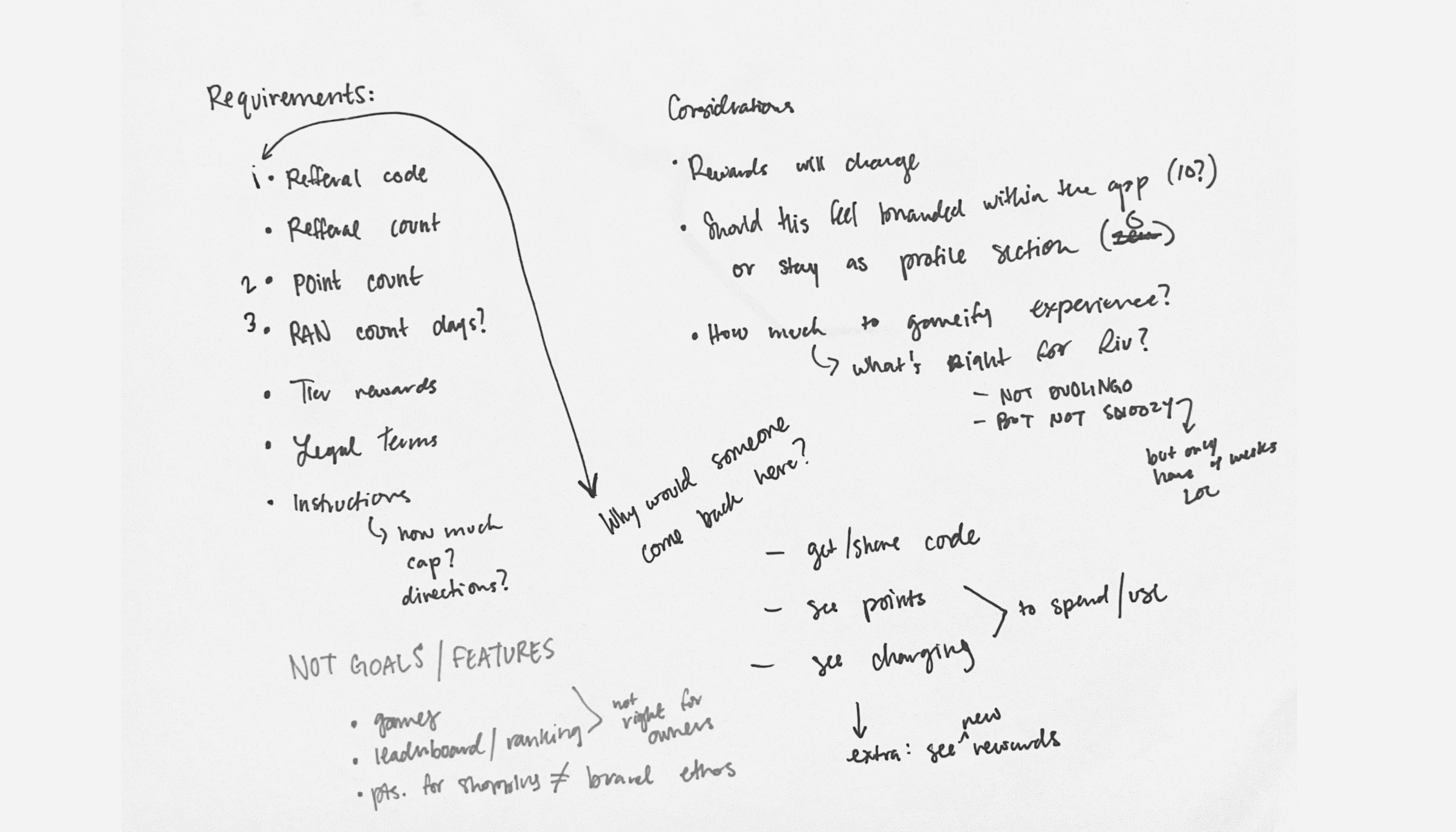 As Rivian explored a loyalty and referral program for the first time, this initiative required a 0-to-1 approach under an aggressive timeline. I started by focusing on establishing the core requirements of the program while identifying key user needs to ensure a meaningful and intuitive experience.