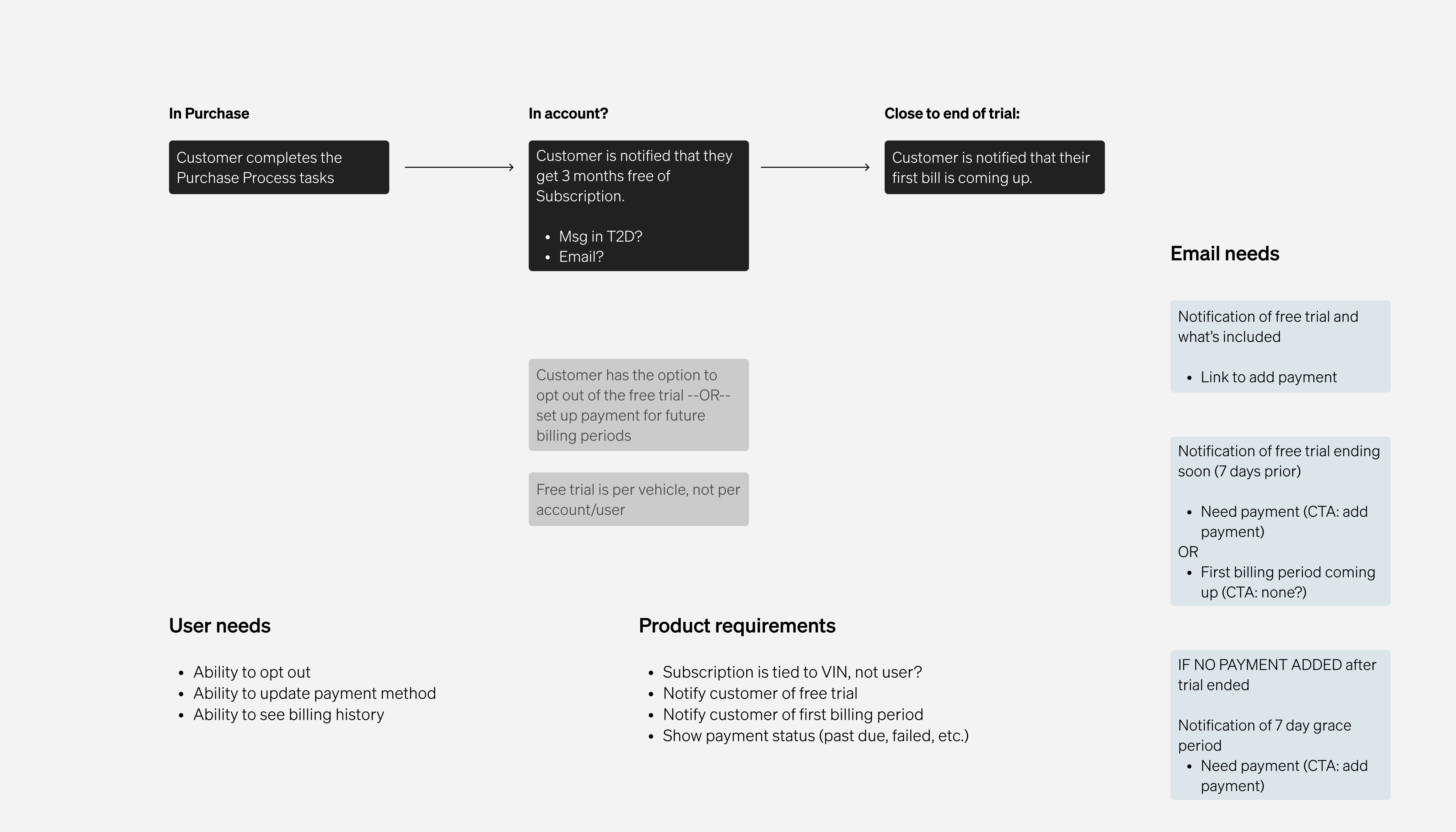 We were asked to begin designing the experience before the actual softwares were finalized. This meant that we were designing in a sea of ambiguity and had to ask hard questions to our software leadership team. I started by outlining what we know (from data and users) and what we don't know and need answers to.