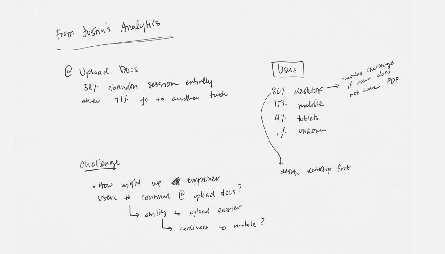 After syncing with our digital analytics team, I learned over 80% of users make their vehicle purchase using a desktop device. Additionally, almost 38% of users were abandoning sessions at the upload documents step.